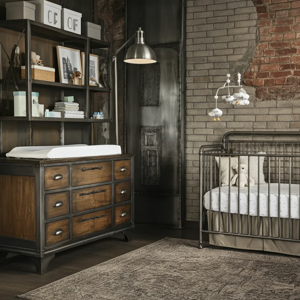Combine metal accents, exposed brick, and neutral tones for an edgy yet cozy nursery.