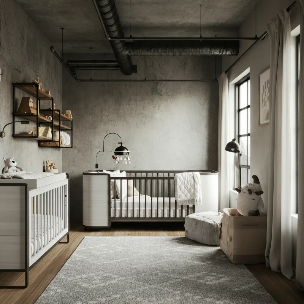 Use exposed pipes, metal accents, and a neutral palette for an industrial-inspired nursery.