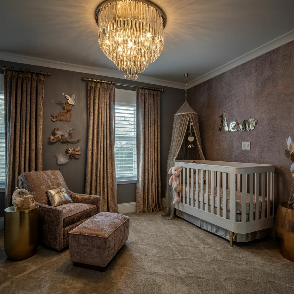 Incorporate velvet fabrics, metallic accents, and a chandelier for a glamorous nursery.