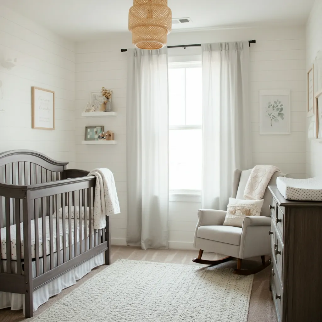 Combine rustic wood furniture, shiplap walls, and cozy textiles for a farmhouse-inspired nursery.