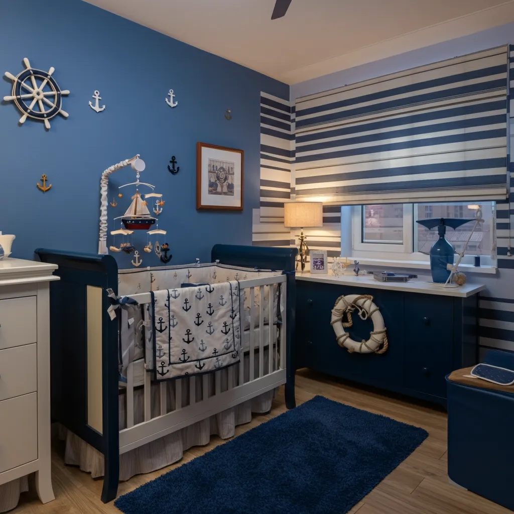 Bring the sea indoors with navy blue accents, anchor motifs, and striped patterns. A ship-shaped mobile adds a playful touch.