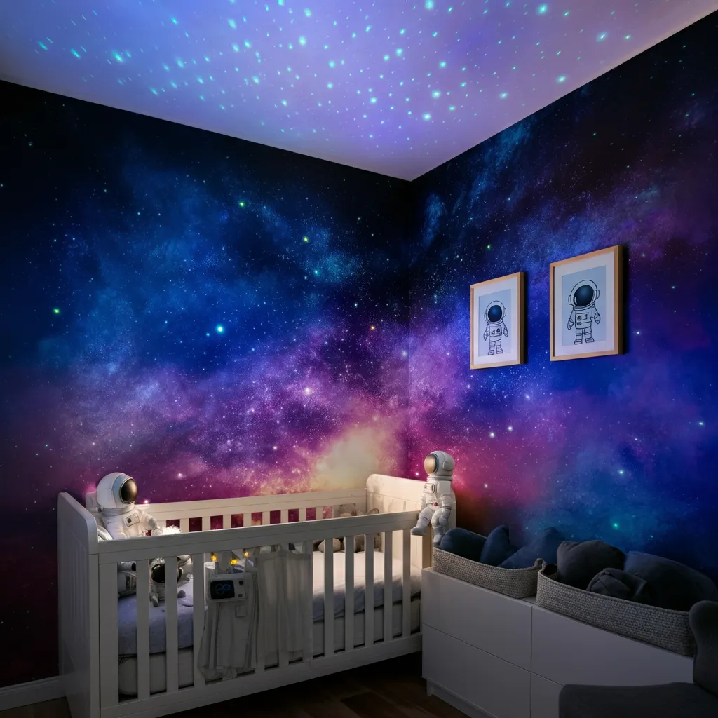 Take the space theme further with a galaxy mural, astronaut decor, and a star projector.