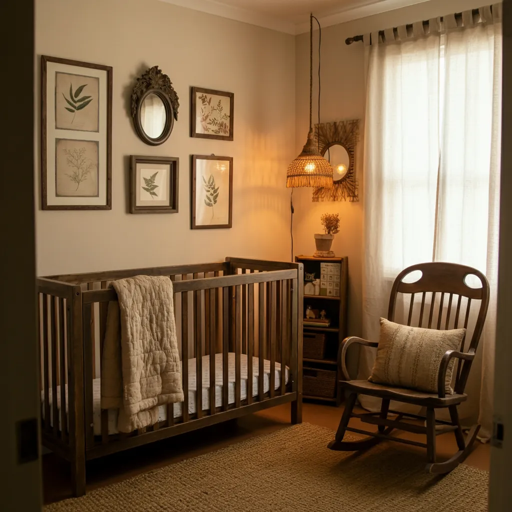 Use reclaimed wood, earthy tones, and vintage decor for a cozy, rustic nursery.