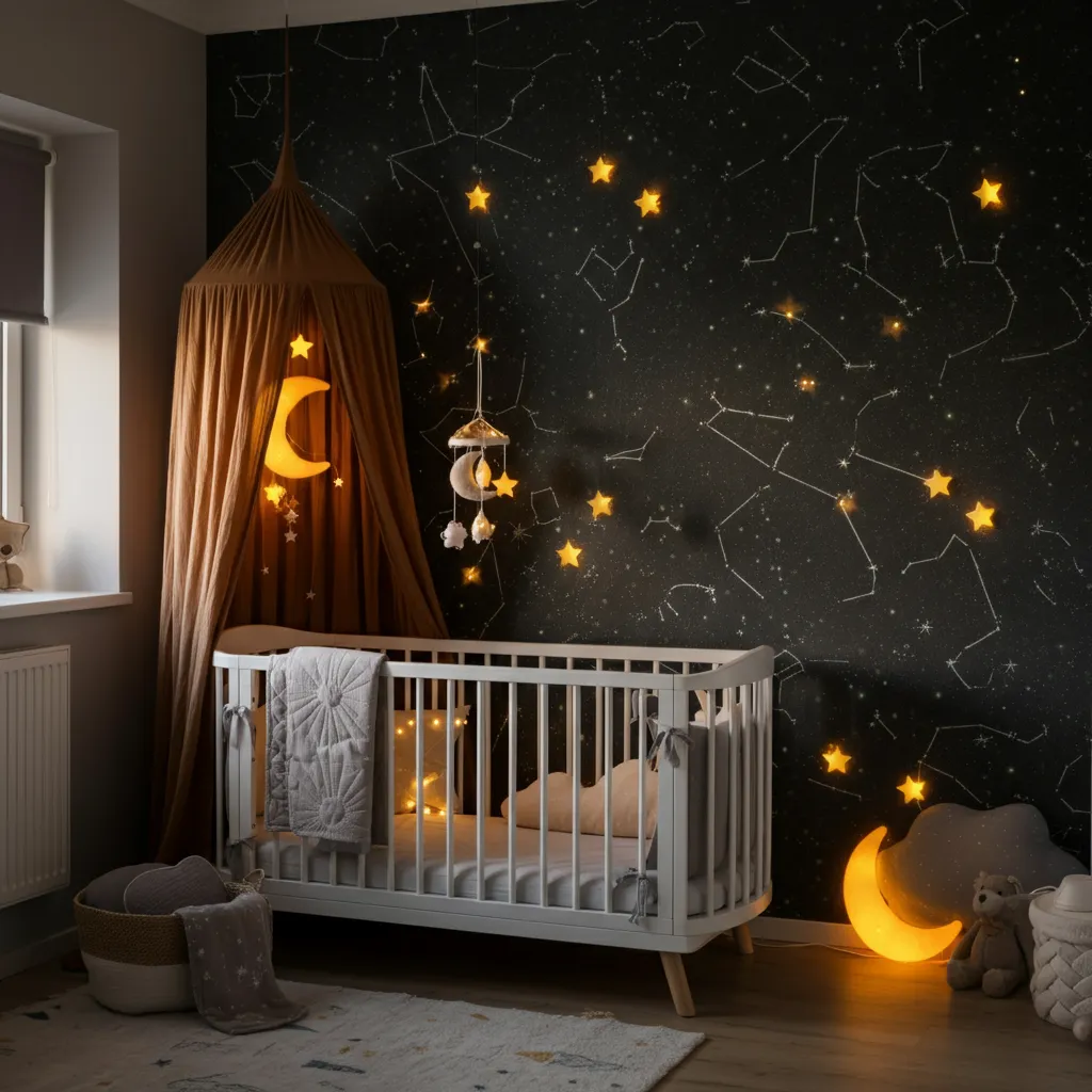 Create a celestial theme with starry wallpaper, moon-shaped decor, and soft lighting.