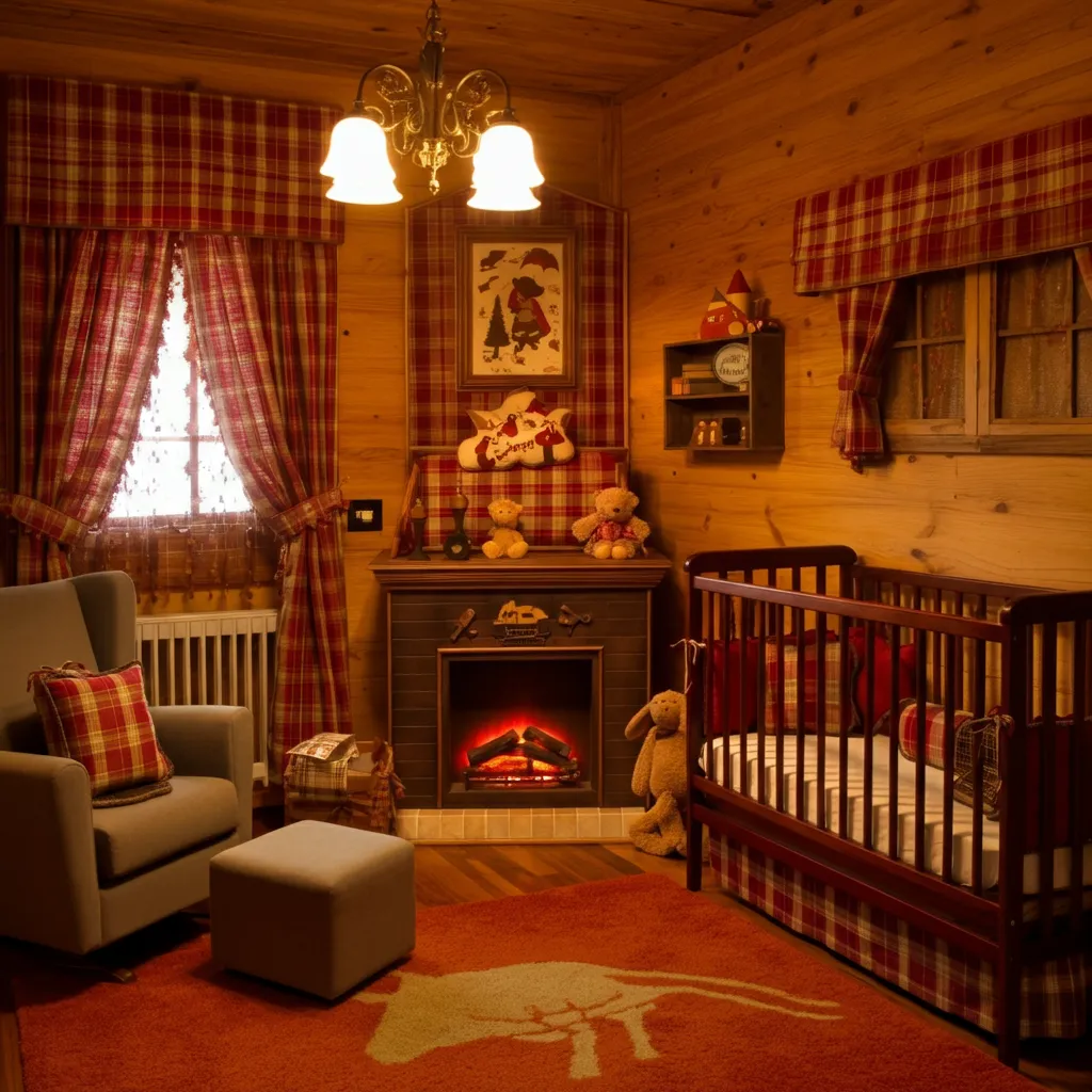 Use warm wood tones, plaid patterns, and a faux fireplace for a cabin-inspired nursery.
