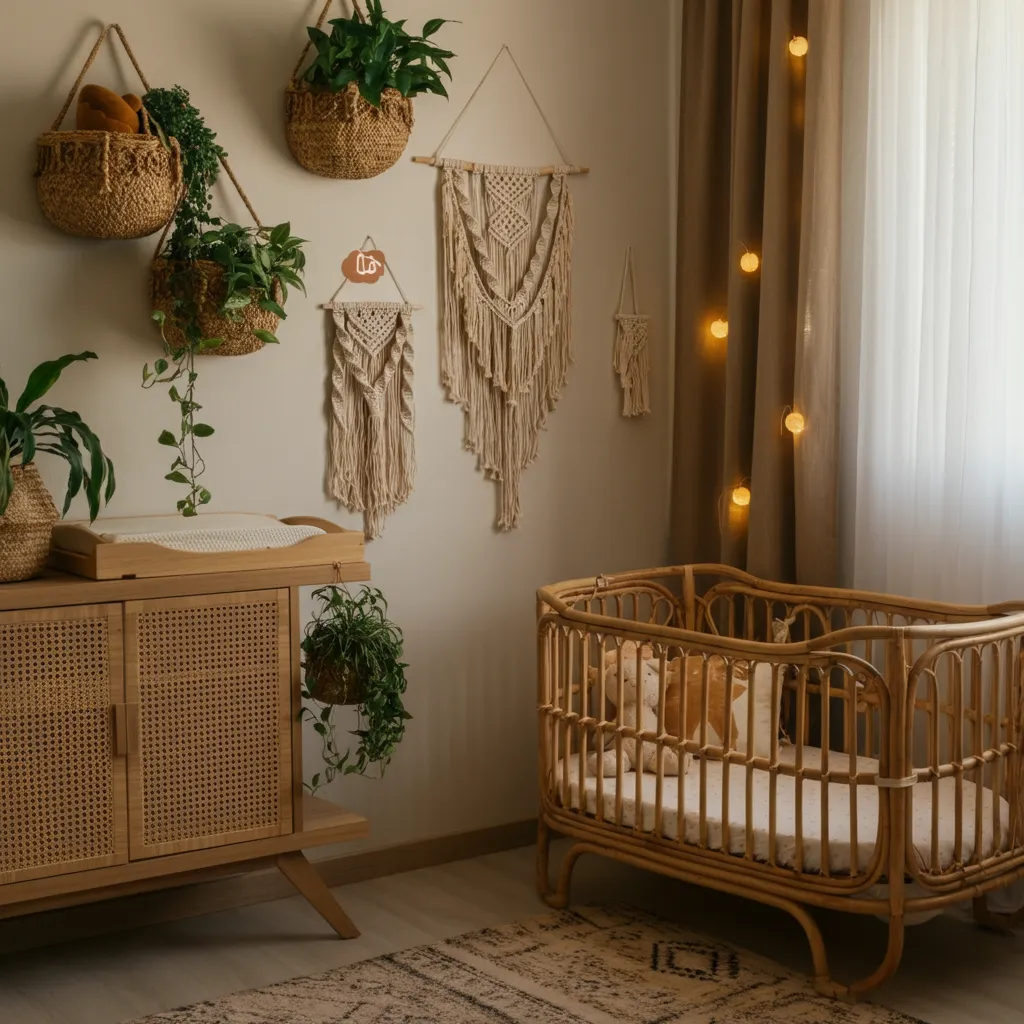 Layer textures like macramé wall hangings, woven baskets, and a rattan crib for a bohemian vibe. Earthy tones and greenery complete the look.