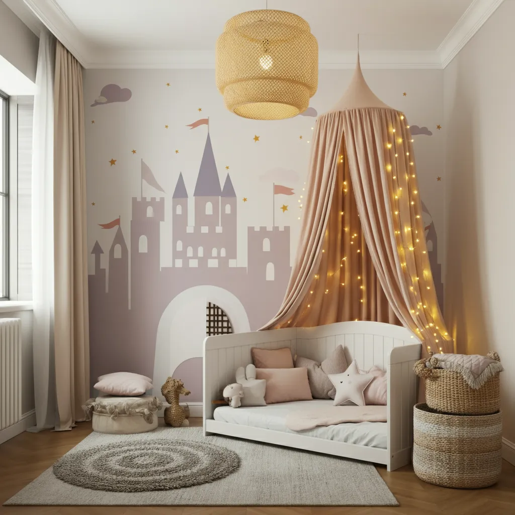 Turn the nursery into a storybook setting with castle decals, fairy lights, and a canopy over the crib.