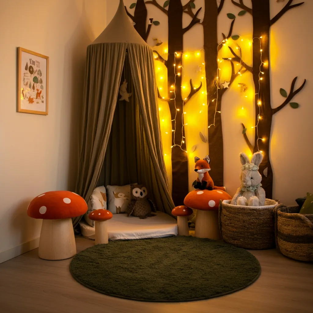 Add a touch of magic with fairy lights, mushroom stools, and woodland animal plushies.