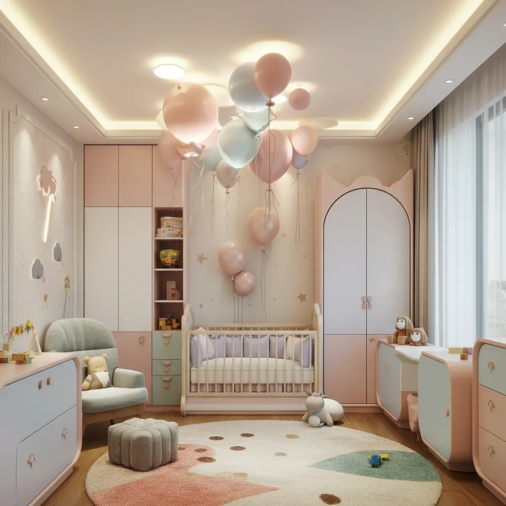 Add balloon-shaped decor, pastel colors, and a playful vibe for a cheerful nursery.