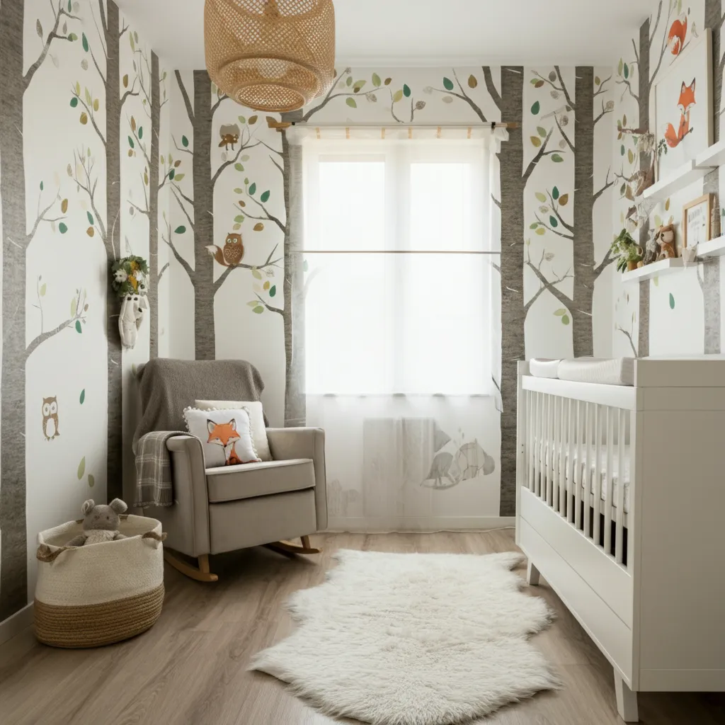 Transform the nursery into a forest retreat with tree decals, animal motifs, and earthy tones. A faux fur rug can add a cozy touch.