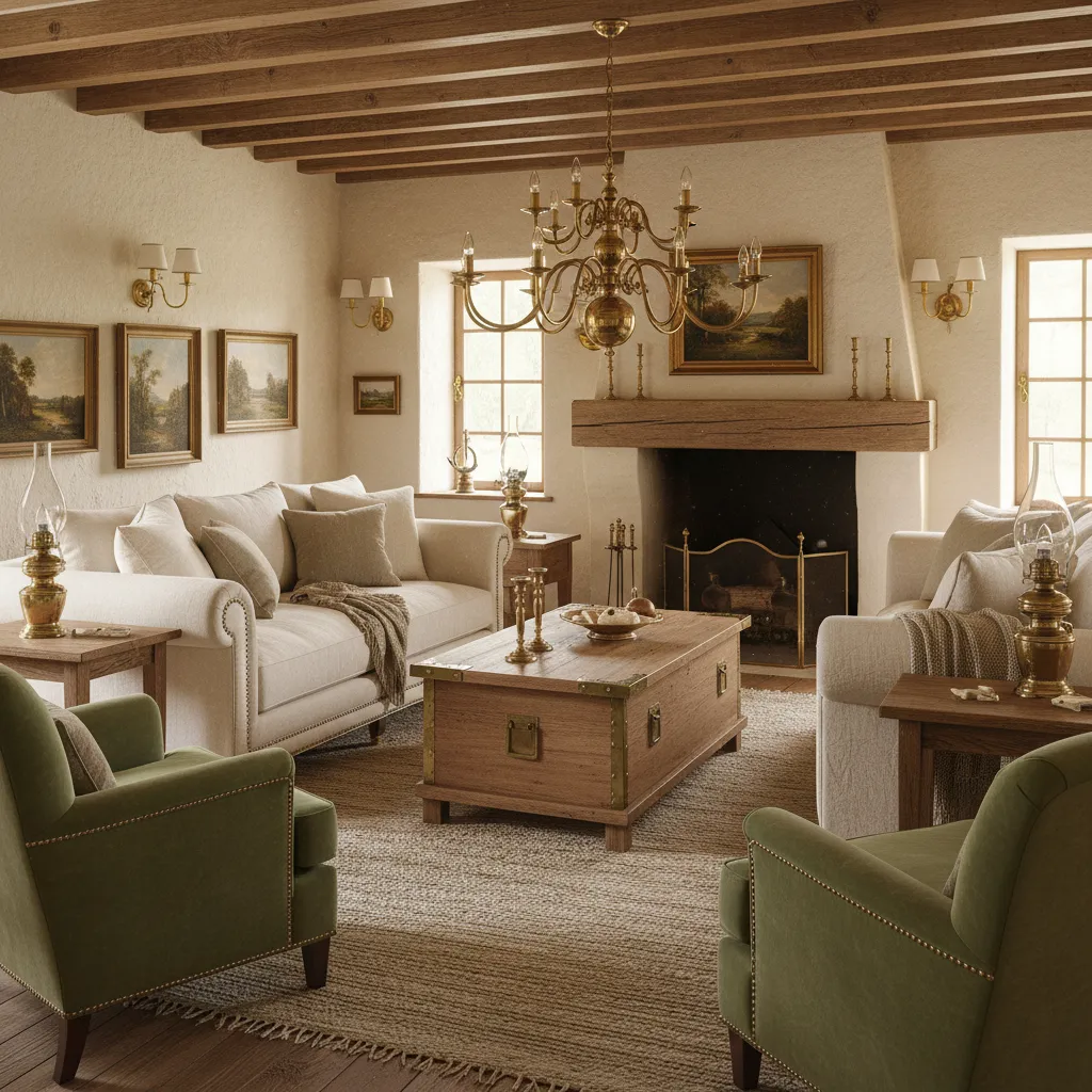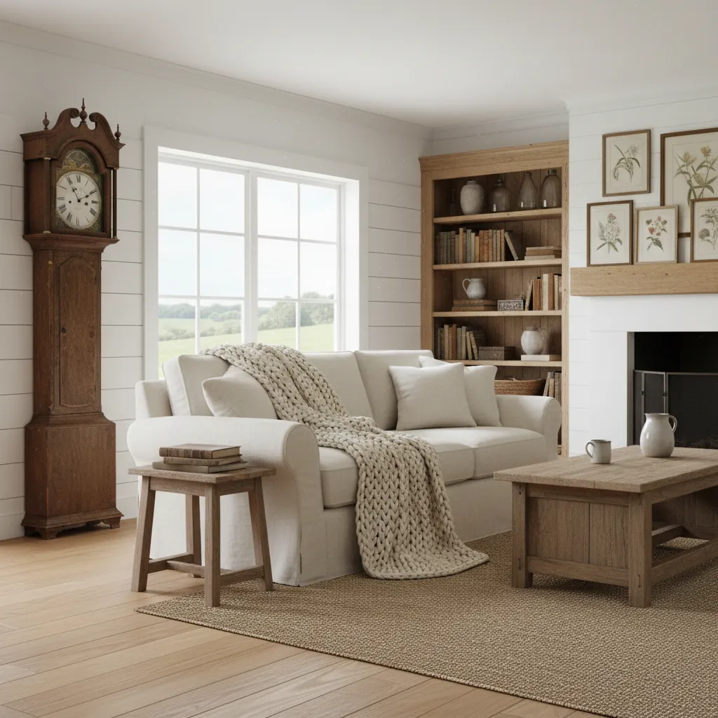 Don’t feel pressured to match your coffee table to your sideboards exactly. The charm of a collected farmhouse room lies in the mix. Pair a dark walnut coffee table with a raw oak console. This variation makes the room feel assembled over generations rather than bought from a catalog in one day.