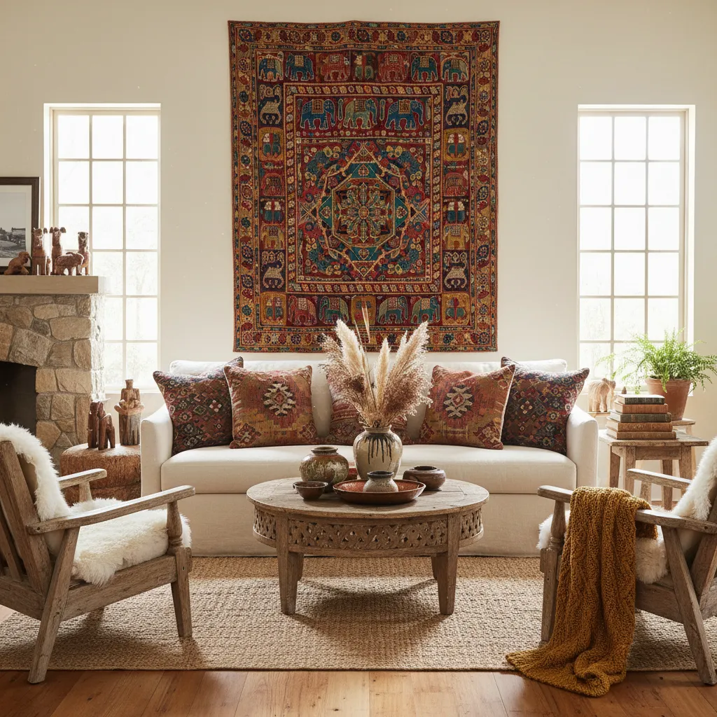 Farmhouse style doesn’t have to be strictly American or European. Incorporating textiles from around the world adds a traveled, eclectic vibe. You might find inspiration in Indian Living Room Decor Ideas, using block-print pillows or intricate tapestries to add color and intricate patterns to your neutral sofa.