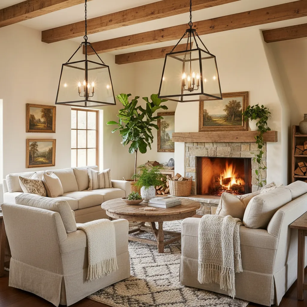 Replace generic ceiling fans or flush mounts with large, lantern-style pendants. Whether in iron, brass, or wood, these fixtures act as jewelry for the room and anchor the seating area from above.