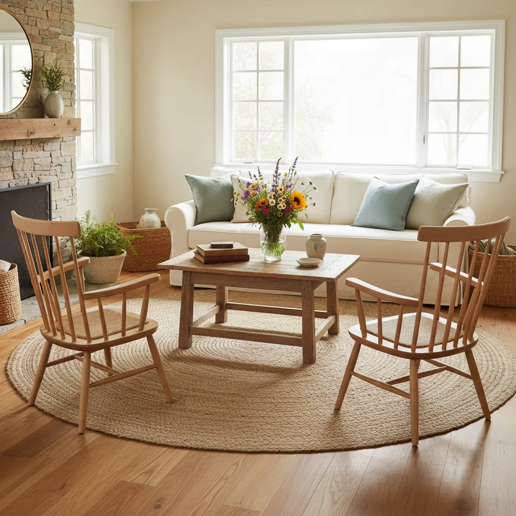 Windsor chairs or spindle-back armchairs add a sculptural element to the room without blocking sightlines. They are lightweight, airy, and nod to traditional American craftsmanship. Place a pair opposite your sofa to create a conversational circle.