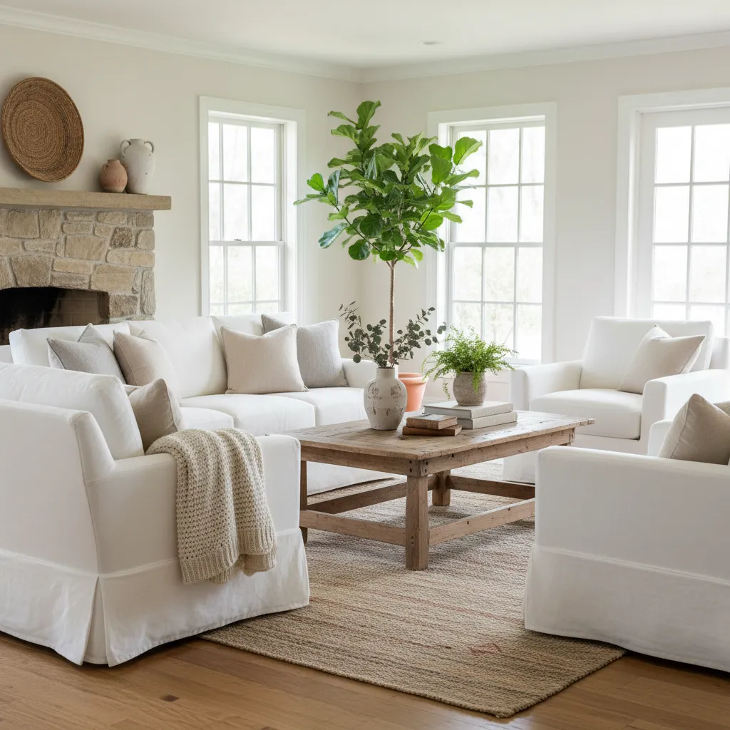 A white or beige slipcovered sofa is the quintessential farmhouse staple. It is practical (just throw the covers in the wash) and offers a relaxed silhouette that stiff upholstery can’t match. Look for linen blends that soften over time.