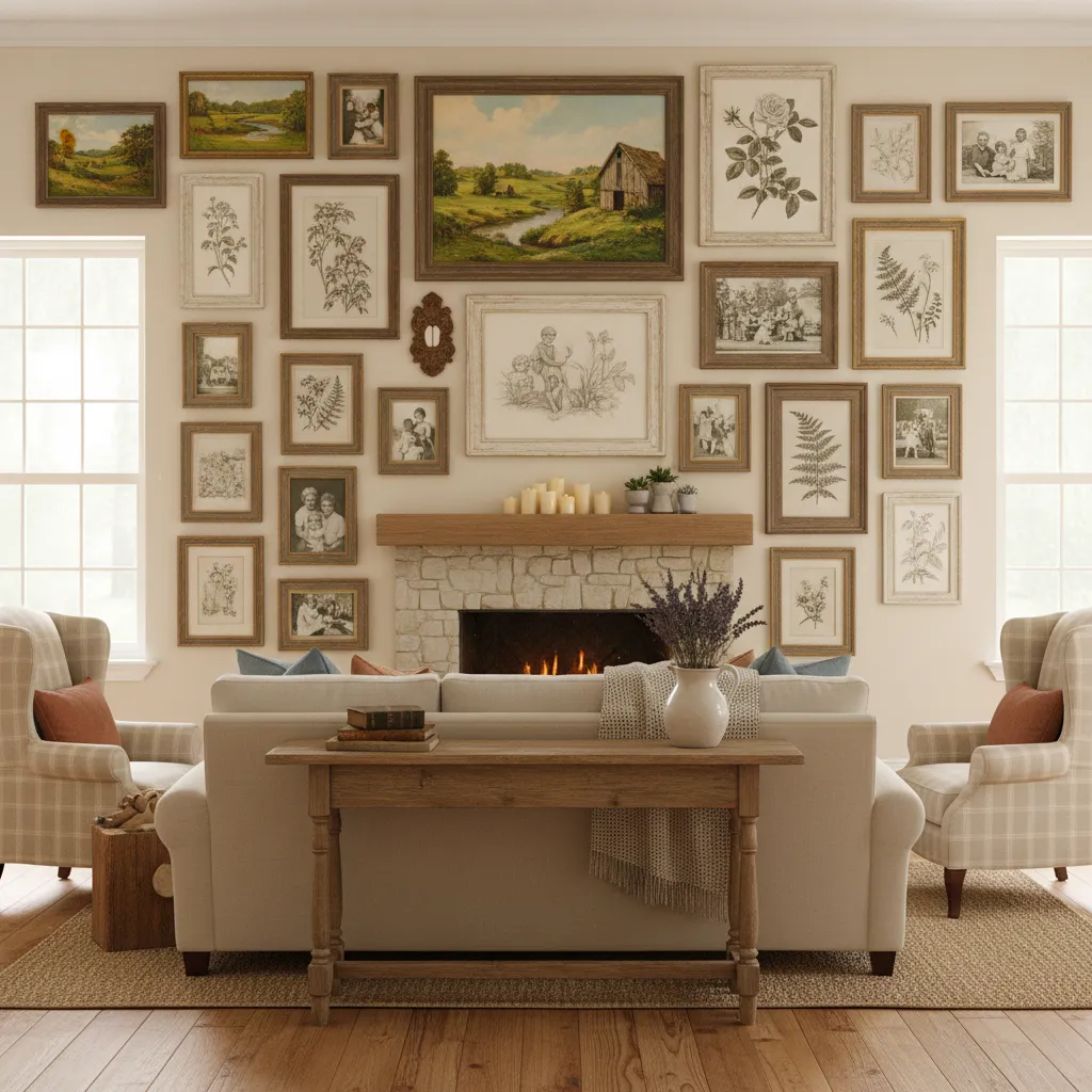Curate a gallery wall using mix-matched frames in wood, gold, and black. Fill them with vintage landscape paintings, botanical sketches, or black-and-white family photos. This becomes a focal point that tells a story.