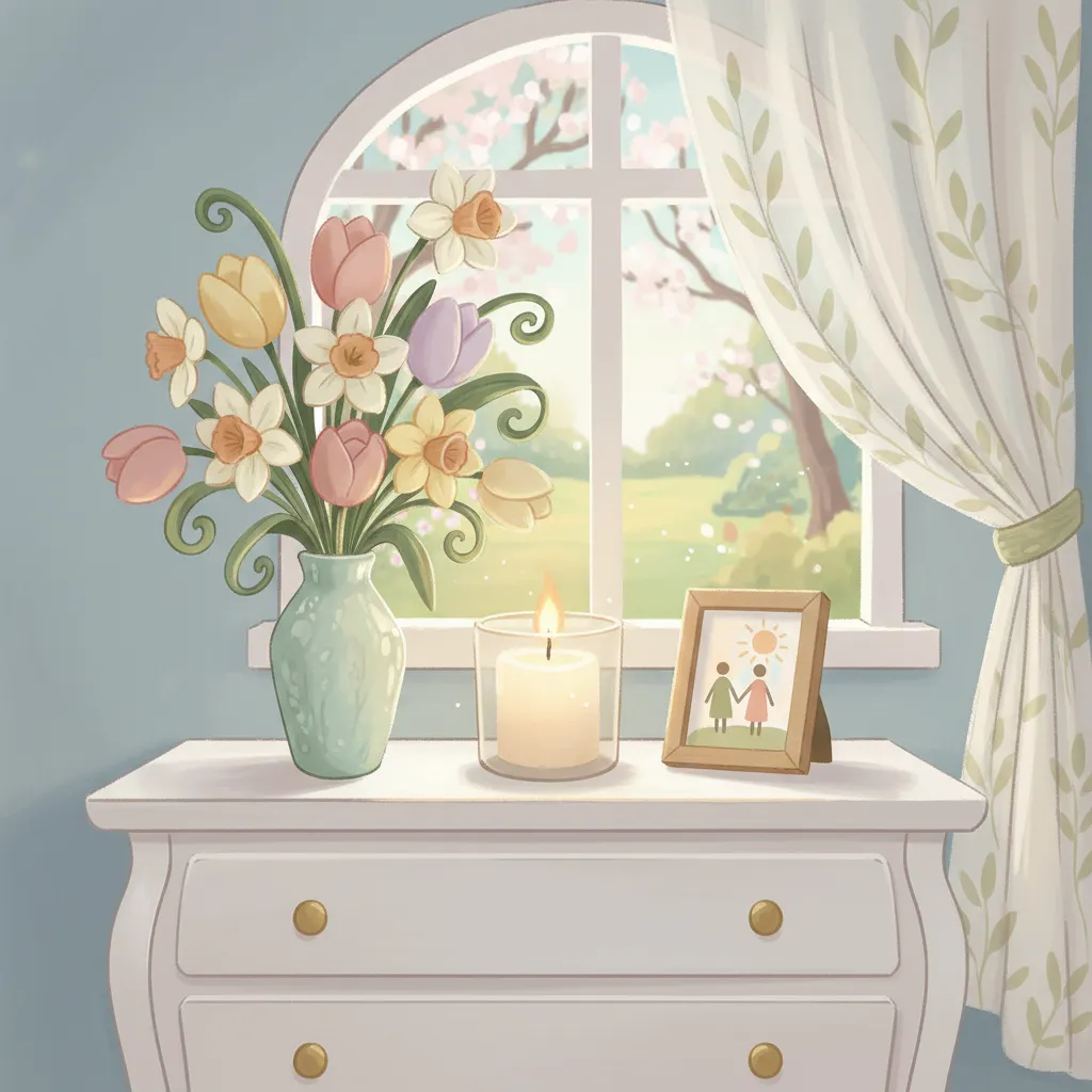 On your dresser, group a few items together: a small tray, a new candle, a jewelry dish, and a framed photo. Keeping the color palette consistent with your overall spring theme will create a cohesive and polished look.