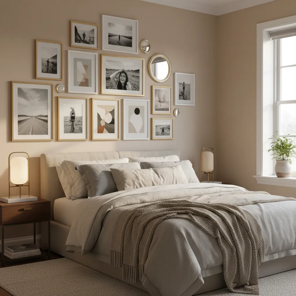 Your space should tell your story. A gallery wall mixing personal photos, art prints, and mirrors adds character.