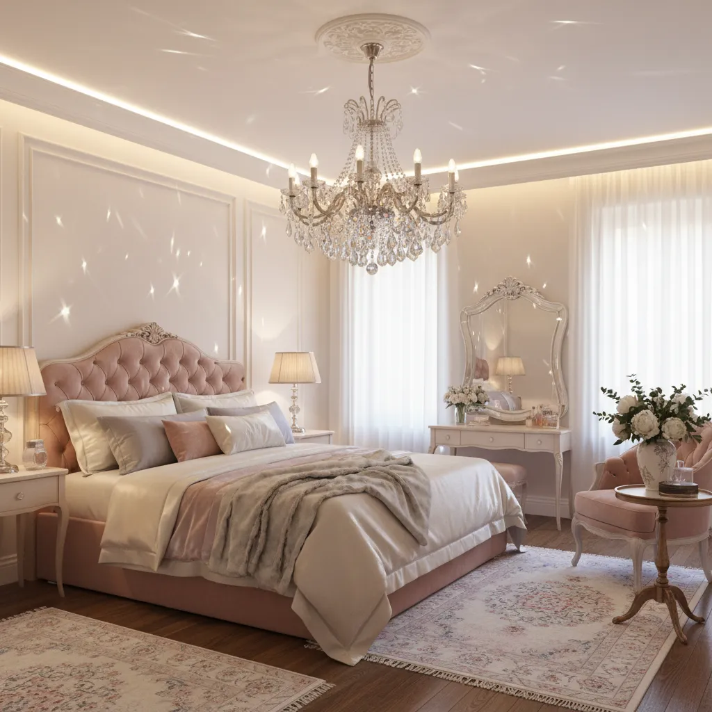 Choose upholstered beds, nightstands with delicate details, dressers with sleek or ornate finishes, and soft seating like chairs or benches. Furniture should be functional while complementing the room’s elegant aesthetic.