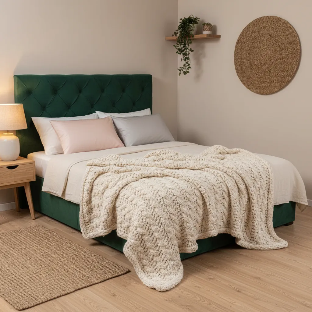 A flat room feels cold. To achieve that “warm and cozy” vibe, you need texture. Mix a chunky knit throw with smooth silk pillowcases and a velvet headboard.