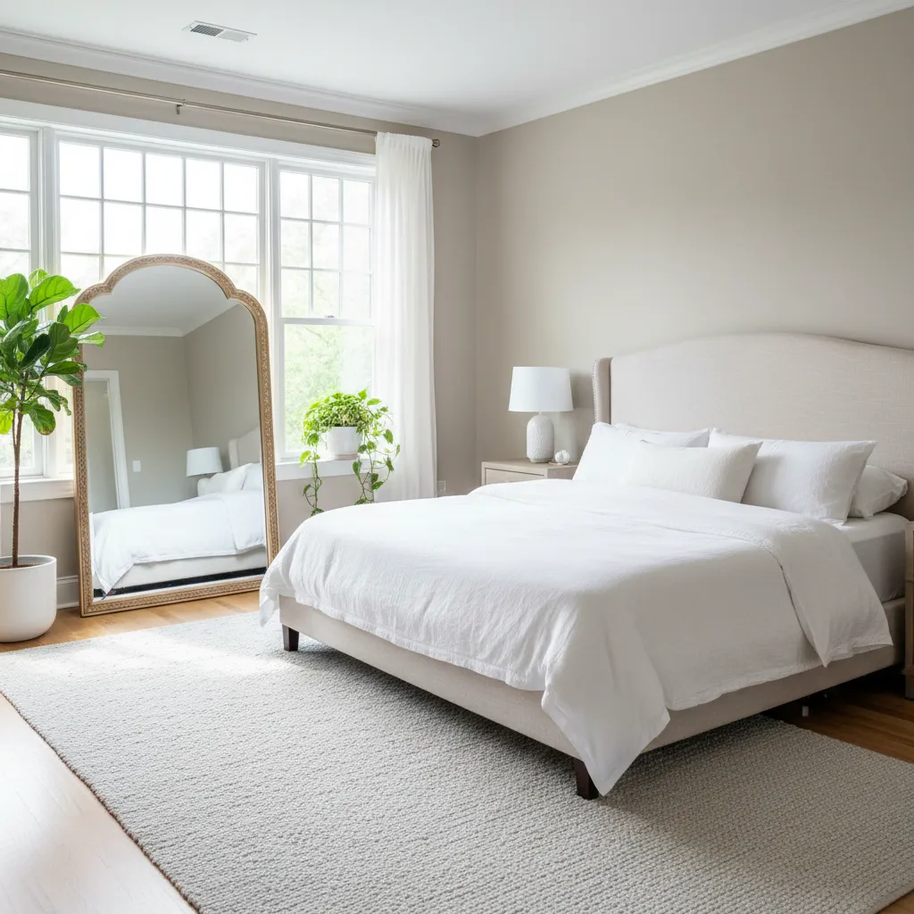 Feminine bedrooms often feel bright and airy. Large floor mirrors or decorative wall mirrors bounce natural light around the room.