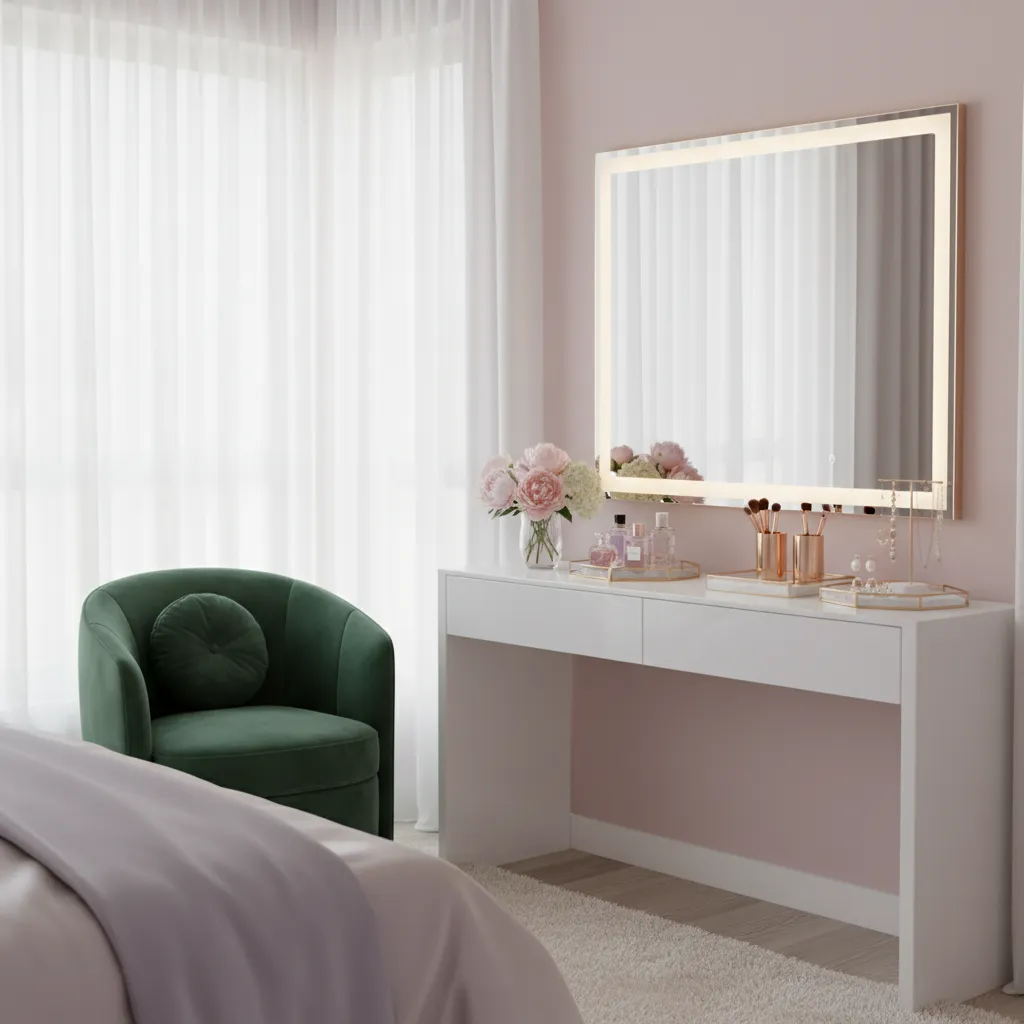 A dedicated space for self-care is a hallmark of a feminine bedroom. Even a small console table with a lighted mirror can serve as a perfect vanity.