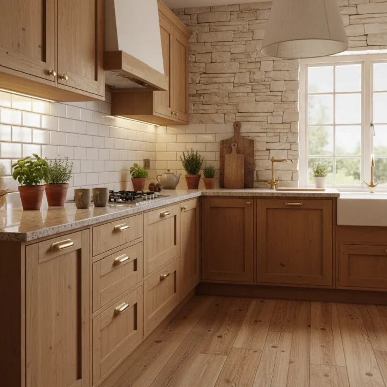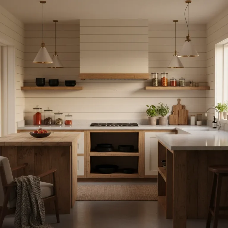 This creates a “slow living” aesthetic. It doesn’t scream for attention but provides a calm, textured background for your ceramics, wooden cutting boards, and open shelving displays.