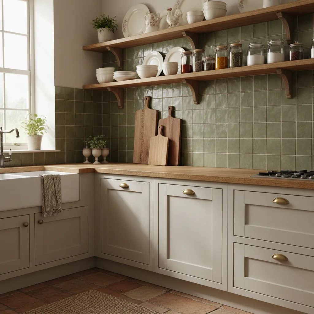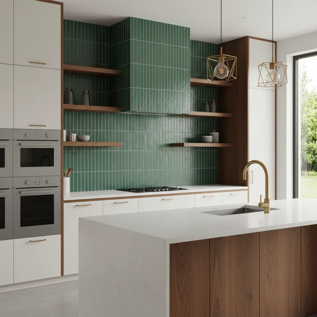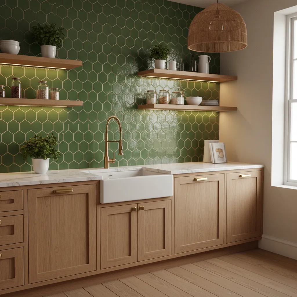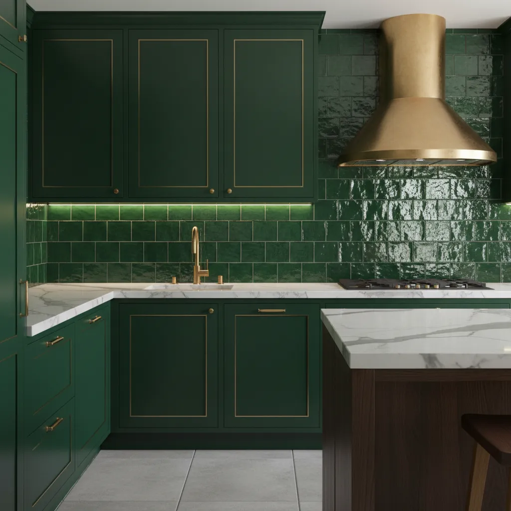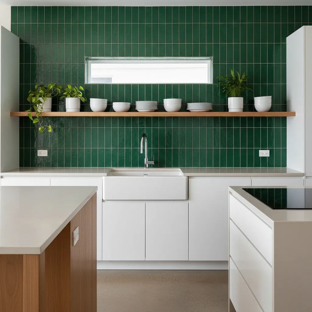 This style works exceptionally well in kitchens that need a focal point. The deep, rich emerald tones bring a sense of luxury and depth, making the kitchen feel intimate and cozy, especially in the evening when under-cabinet lighting hits the uneven surface of the glaze.