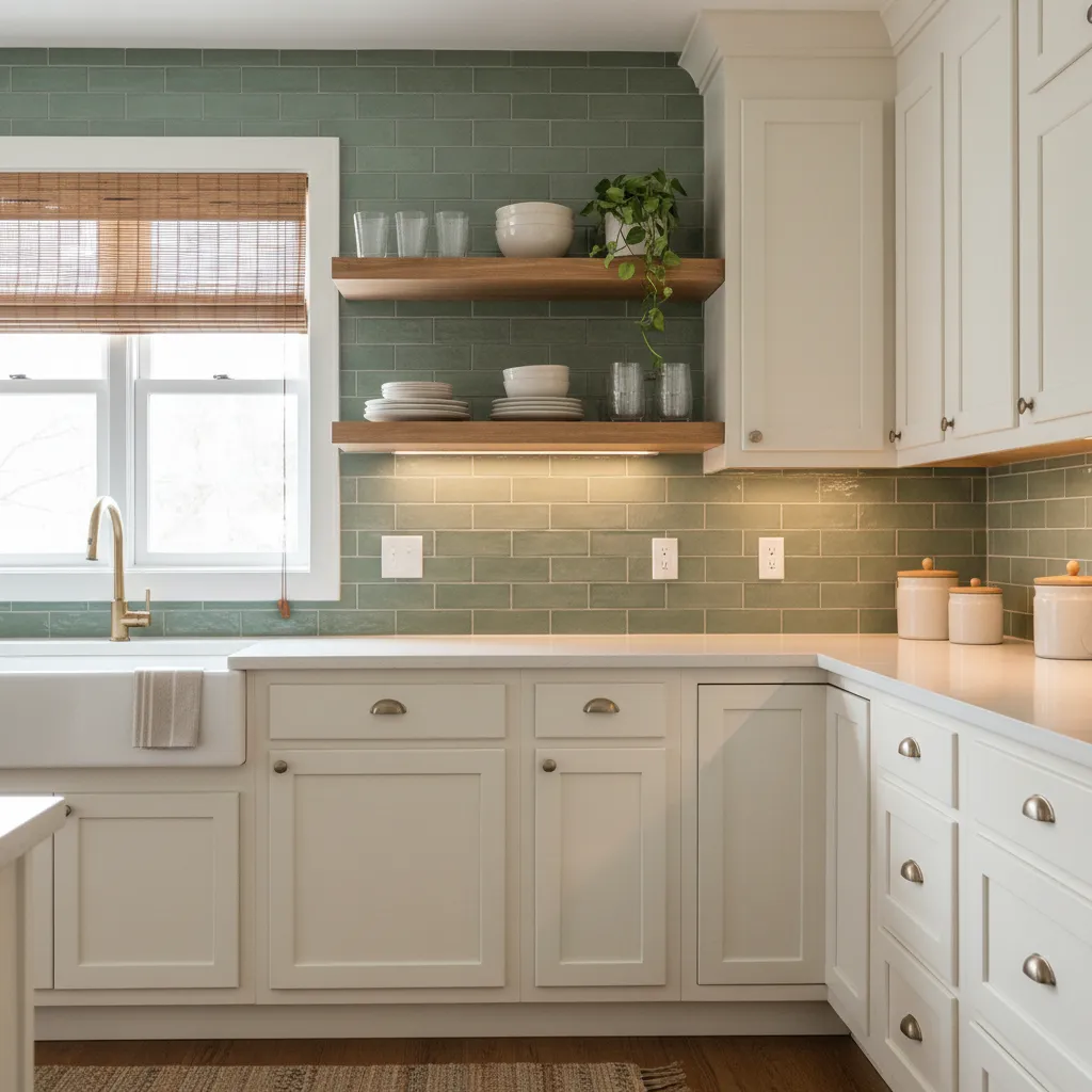 Let’s start with a choice that feels like a warm hug: sage green subway tiles. This is perhaps the most versatile option on our list. Sage is a muted, greyish-green that pairs beautifully with creamy white cabinets and natural wood shelves. It is subtle enough not to overwhelm the eye but colorful enough to add personality.