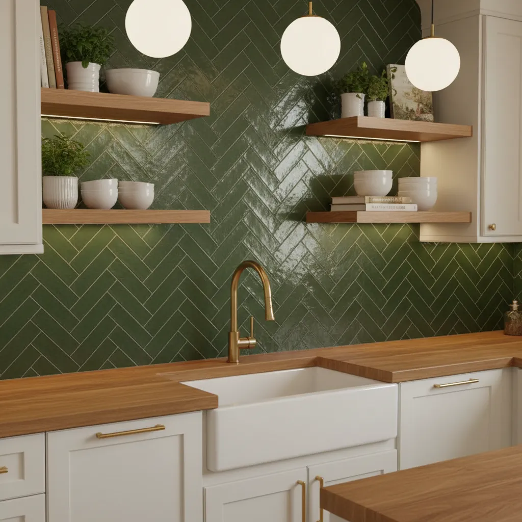 For those who love a bit of structure with their color, an olive green backsplash laid in a herringbone pattern is a winner. Olive is an earthy, grounded shade that feels very sophisticated. It pairs wonderfully with warm metals like unlacquered brass or copper.