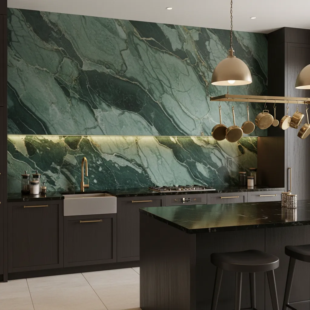 For the ultimate in luxury and seamless design, skip the individual tiles and go for a solid slab of green marble or quartzite. Stones like Verde Alpi or Rainforest Green feature stunning veining that looks like a piece of abstract art.