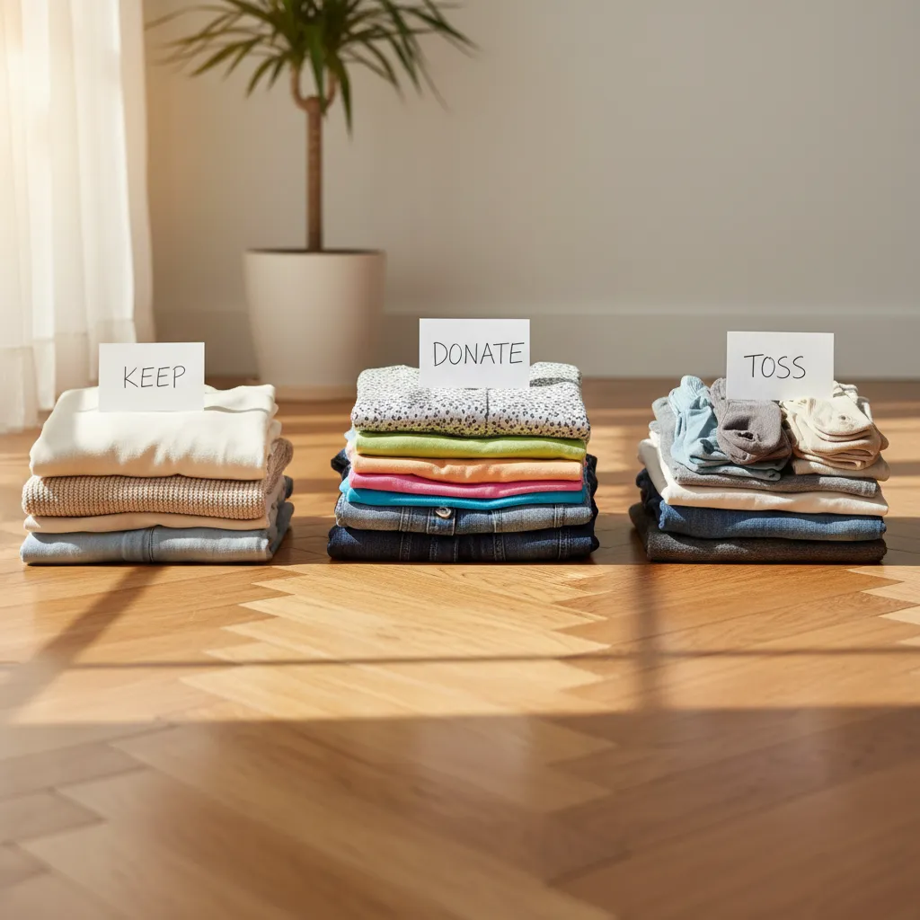 Create three piles: Keep, Donate, and Toss. Be honest with yourself—if something doesn’t spark joy or serve a purpose, it’s time to let it go.