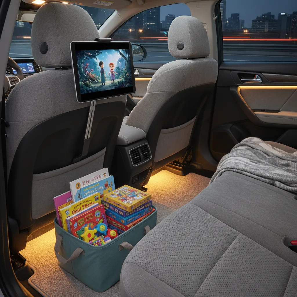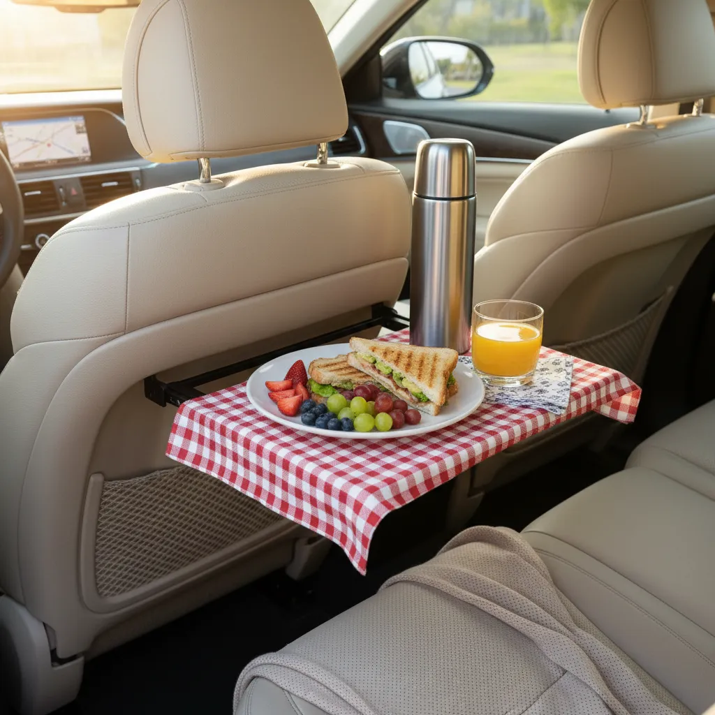 - Lay down waterproof mats or rugs to protect the car floor and add a homey feel.