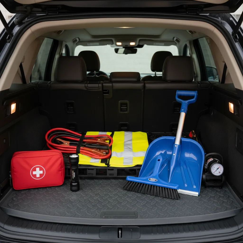 - Include a snow shovel and ice scraper for winter conditions.