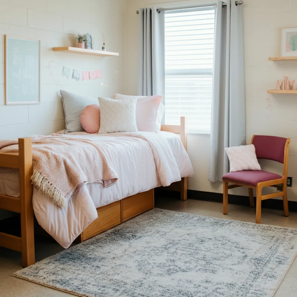 A soft area rug instantly adds warmth and defines your space. Layering different textures with throw blankets and decorative pillows on your bed or chair makes the room feel much cozier and more inviting.