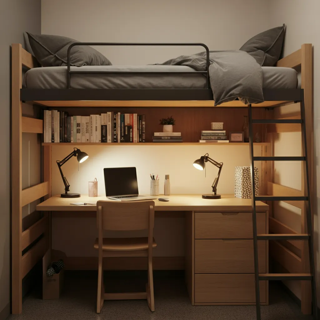 Dorm room decor focuses on maximizing space, comfort, and personal style. Key elements include multifunctional furniture, cozy bedding, storage solutions, wall art, and decorative accents that make a small space feel inviting and functional.