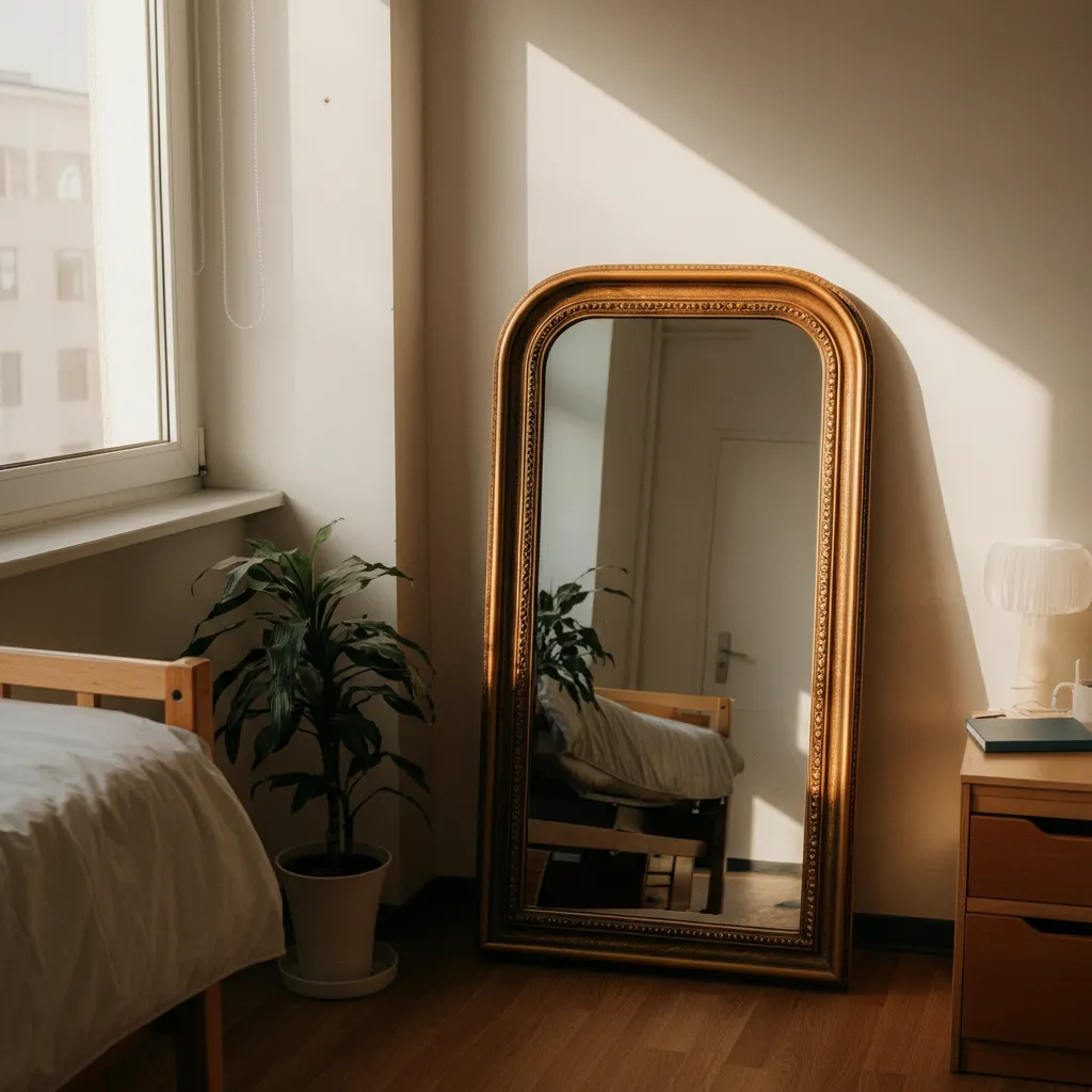 A large mirror can make a small room feel bigger and brighter by reflecting light. Look for one with an interesting frame—like a vintage-style gold mirror or a modern round one—to double as a piece of wall art.