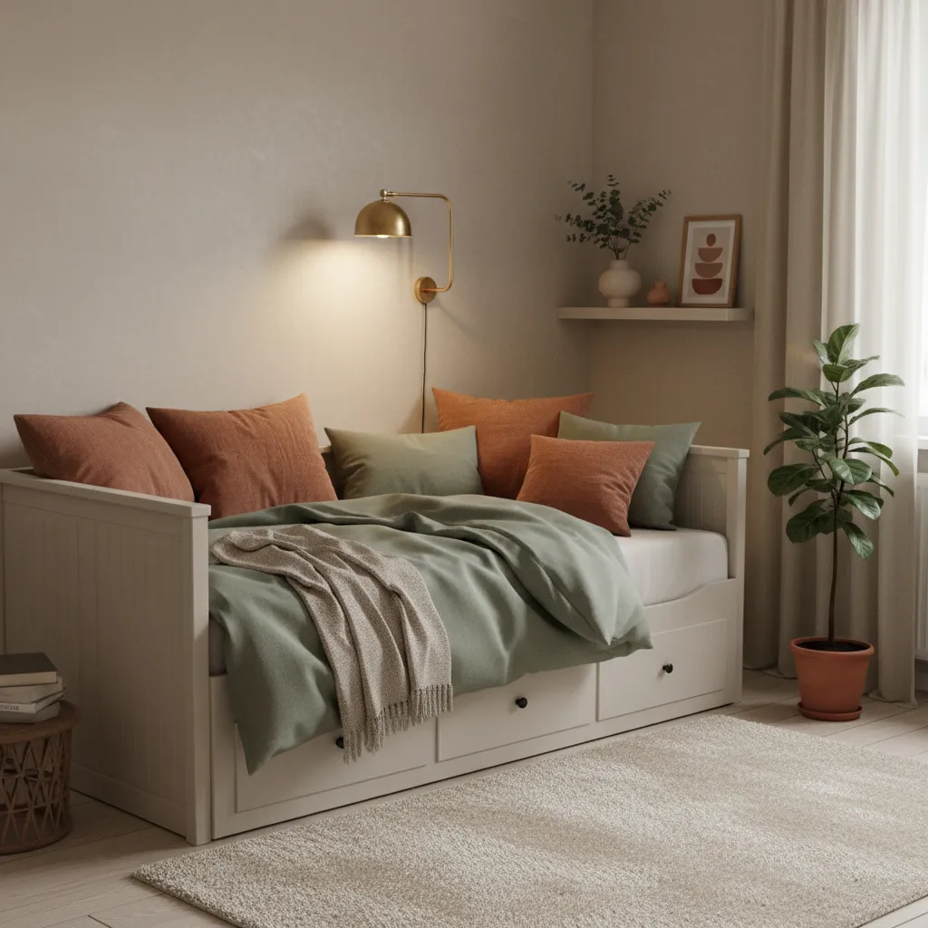 For smaller bedrooms or guest rooms, the HEMNES daybed is a lifesaver. Instead of treating it like utility furniture, dress it up with high-quality linen bedding in moody earth tones like terracotta or sage green. Add a wall-mounted sconce above it to create a dedicated reading nook feel.