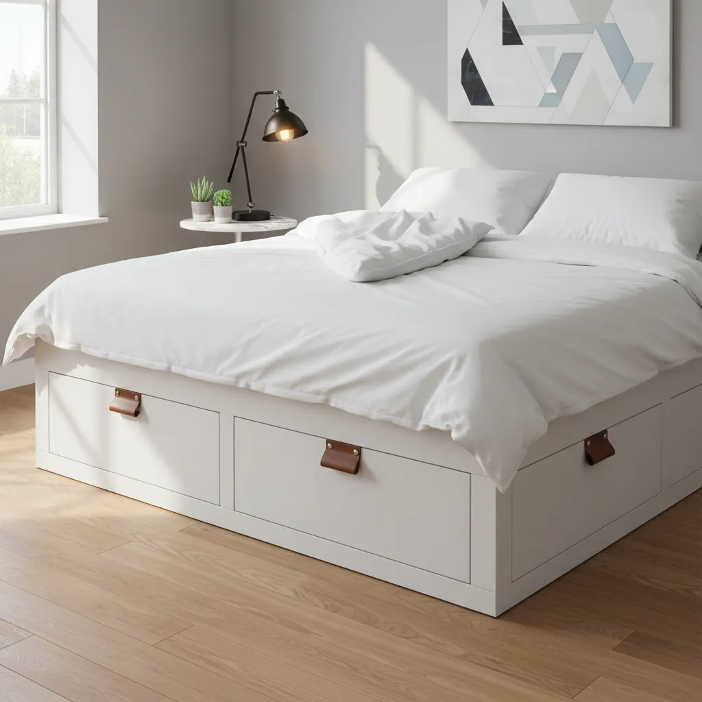 If you are short on closet space, the NORDLI bed frame offers deep drawers underneath. Use this space for seasonal clothes or bulky linens. Keep the handles sleek or swap them out for leather pulls to add a tactile, organic element to the sleek white finish.
