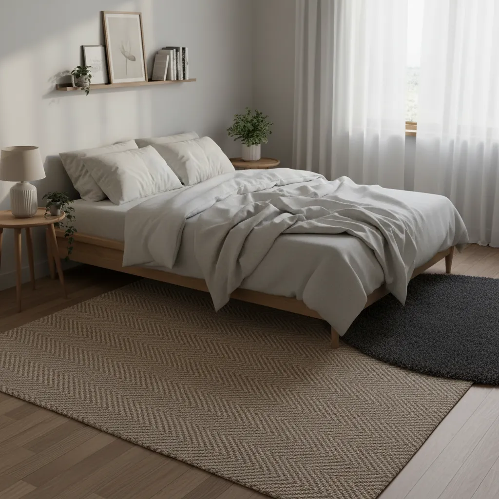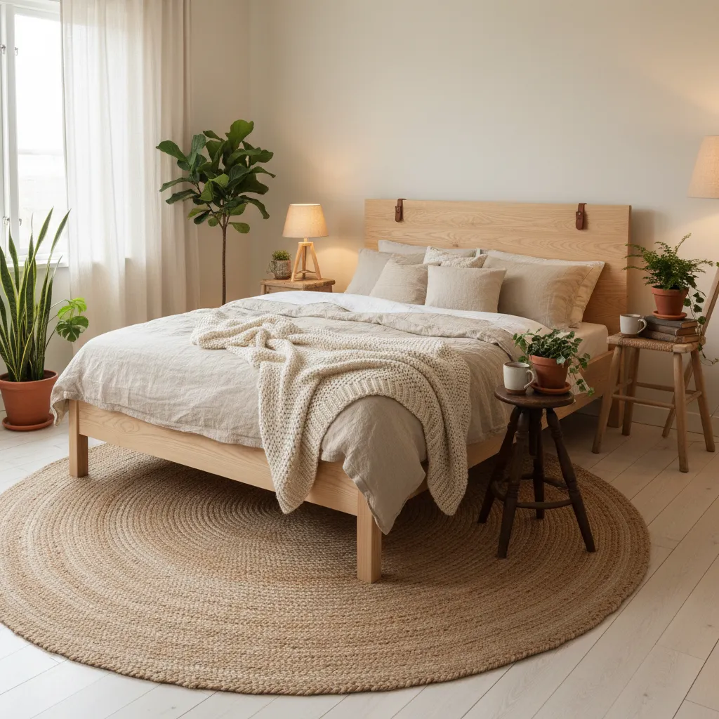 Start with a large, flatwoven LOHALS jute rug to cover most of the floor. Then, layer a smaller, softer STOENSE rug (or a faux sheepskin) beside the bed. Stepping onto something plush first thing in the morning is a small luxury that makes a big difference.
