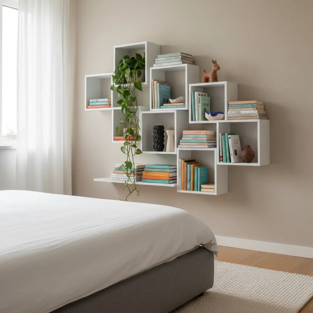 Instead of heavy bookcases, install floating EKET cubes in an asymmetrical pattern above a dresser. Use them to display your favorite books, a trailing pothos plant, or small ceramic art pieces. It keeps the floor clear and draws the eye upward.