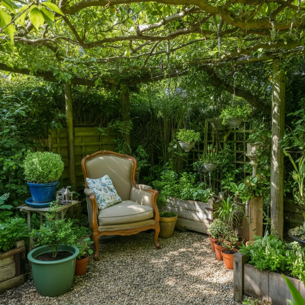 Tuck a single armchair or a small bistro set into a quiet corner. Surrounded by pots and planters, this creates an intimate spot perfect for reading a book or enjoying a morning coffee.