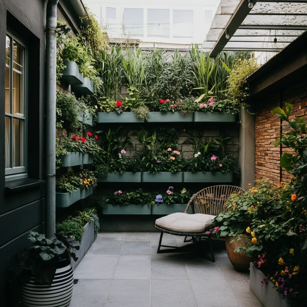 Incorporate vertical elements like trellises, wall planters, or hanging baskets. Use mirrors or reflective surfaces, colorful pots, and layered textures with plants and ground covers. Lighting, such as solar lights or string lights, can make the space inviting during evenings.