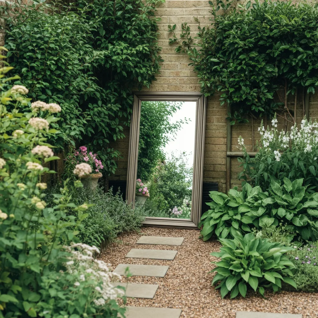 A well-placed outdoor mirror is a classic trick to create the illusion of more space. It reflects light and greenery, making the garden feel brighter and deeper. Frame it with plants to blend it into the scenery.