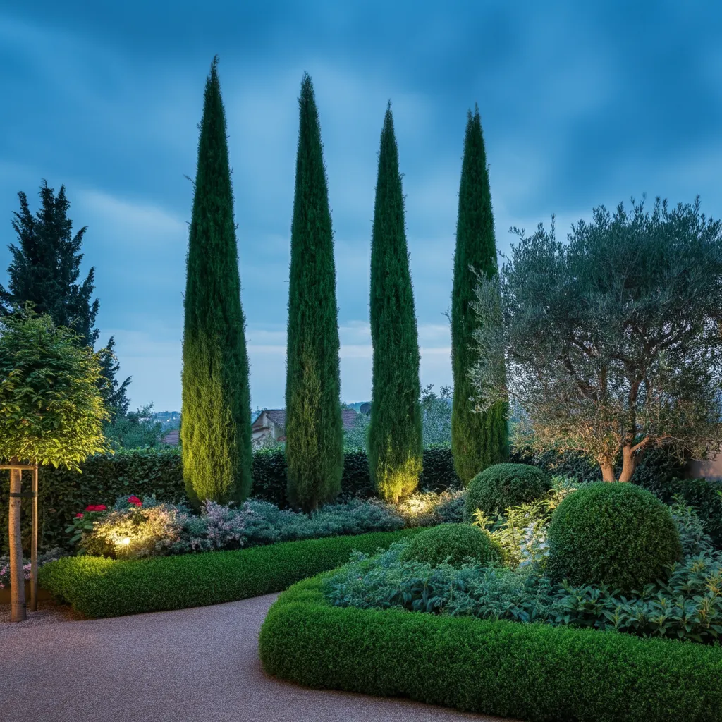 For a touch of height and elegance, choose columnar trees like Italian cypress or slender varieties of birch. They provide vertical interest and a bit of shade without casting too much shadow or taking up a wide footprint.