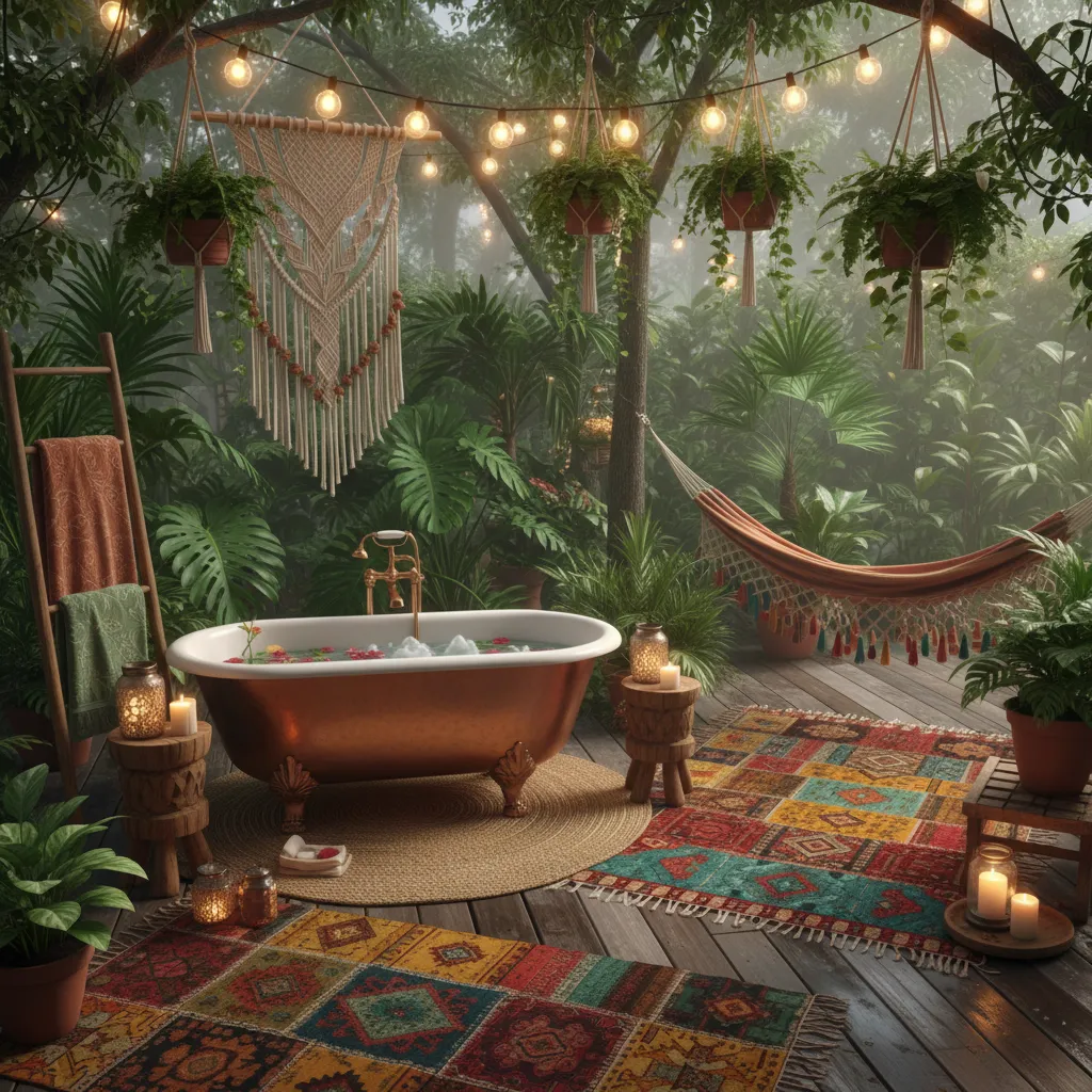 Add a boho touch to your outdoor bathroom with vibrant rugs, patterned towels, and macramé hangings. This style is perfect for those who love eclectic and cozy decor ideas.
