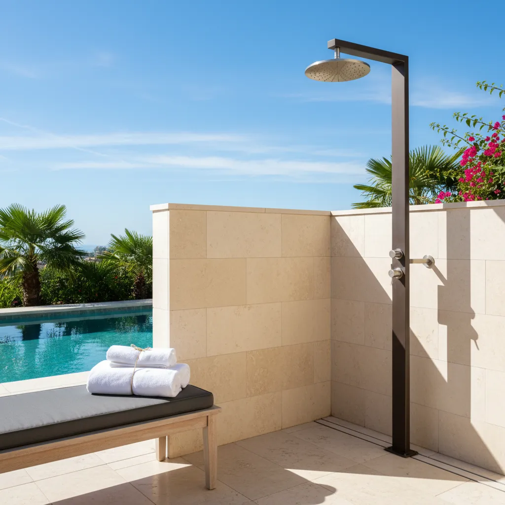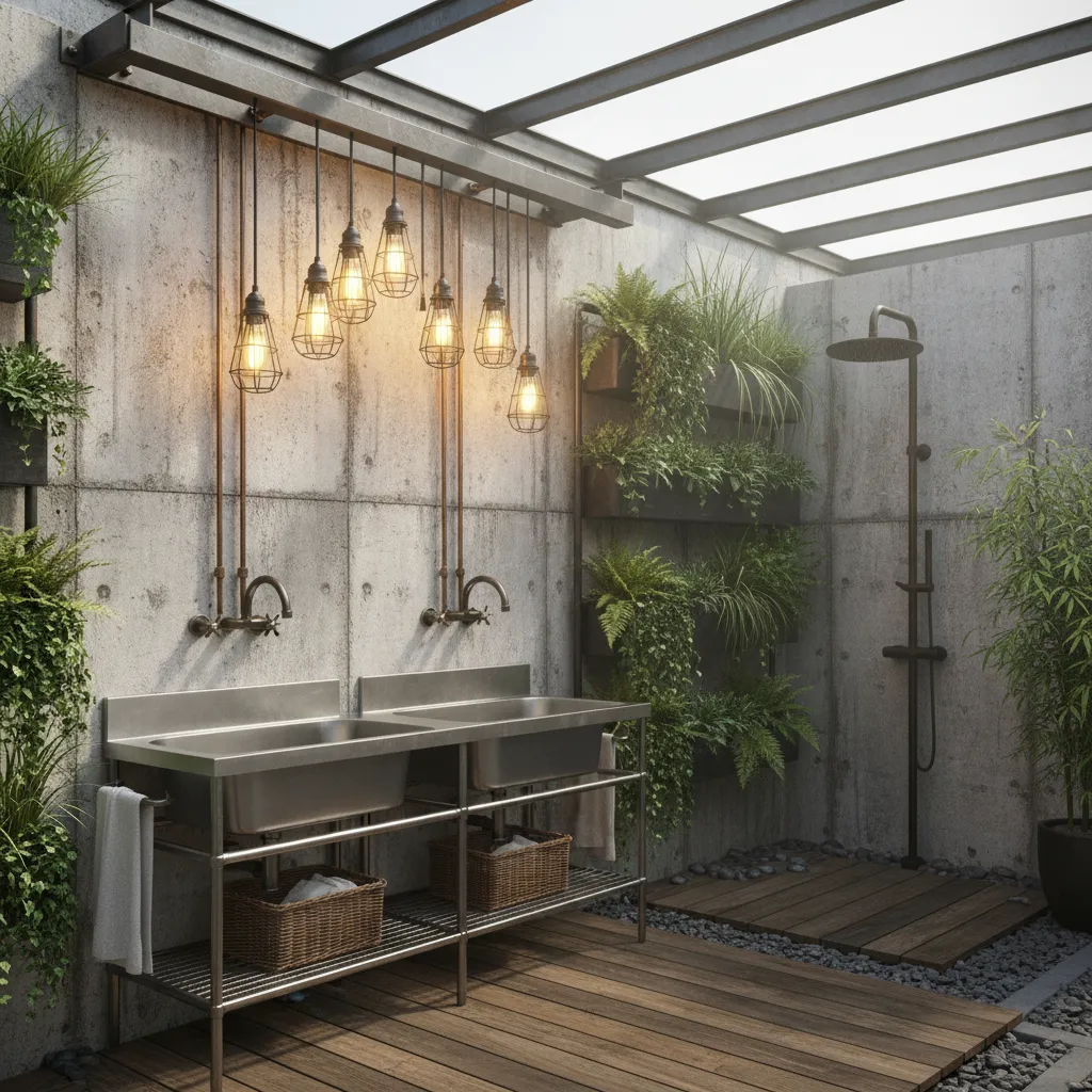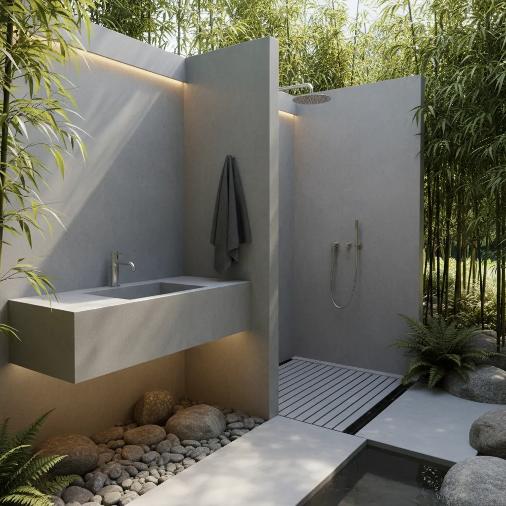For a sleek and modern look, opt for concrete finishes. A concrete sink or shower area paired with minimalist decor can create a chic, understated outdoor bathroom.