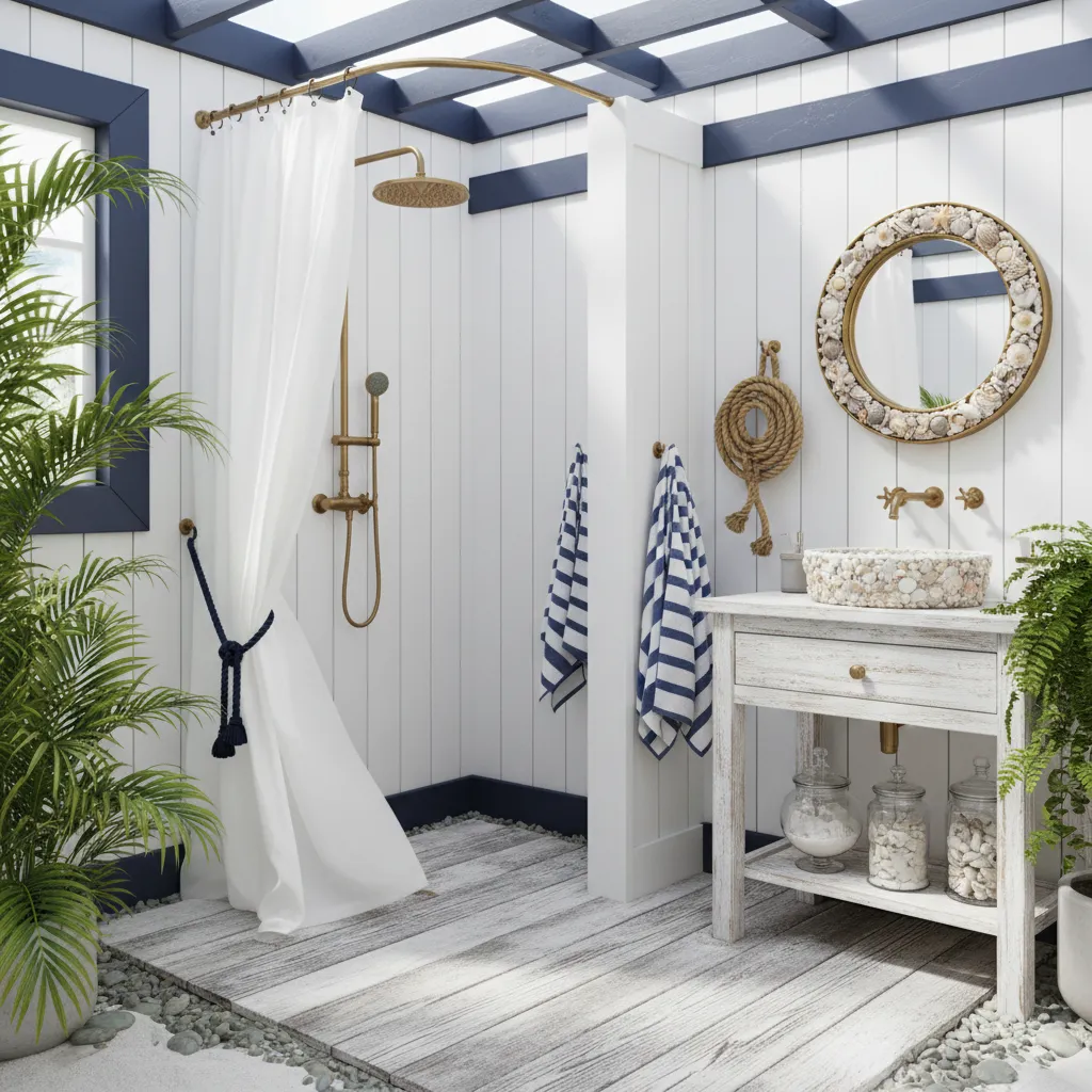 Channel the calming vibes of the ocean with a nautical-themed outdoor bathroom. Use blue and white color schemes, rope accents, and seashell decor to complete the look.