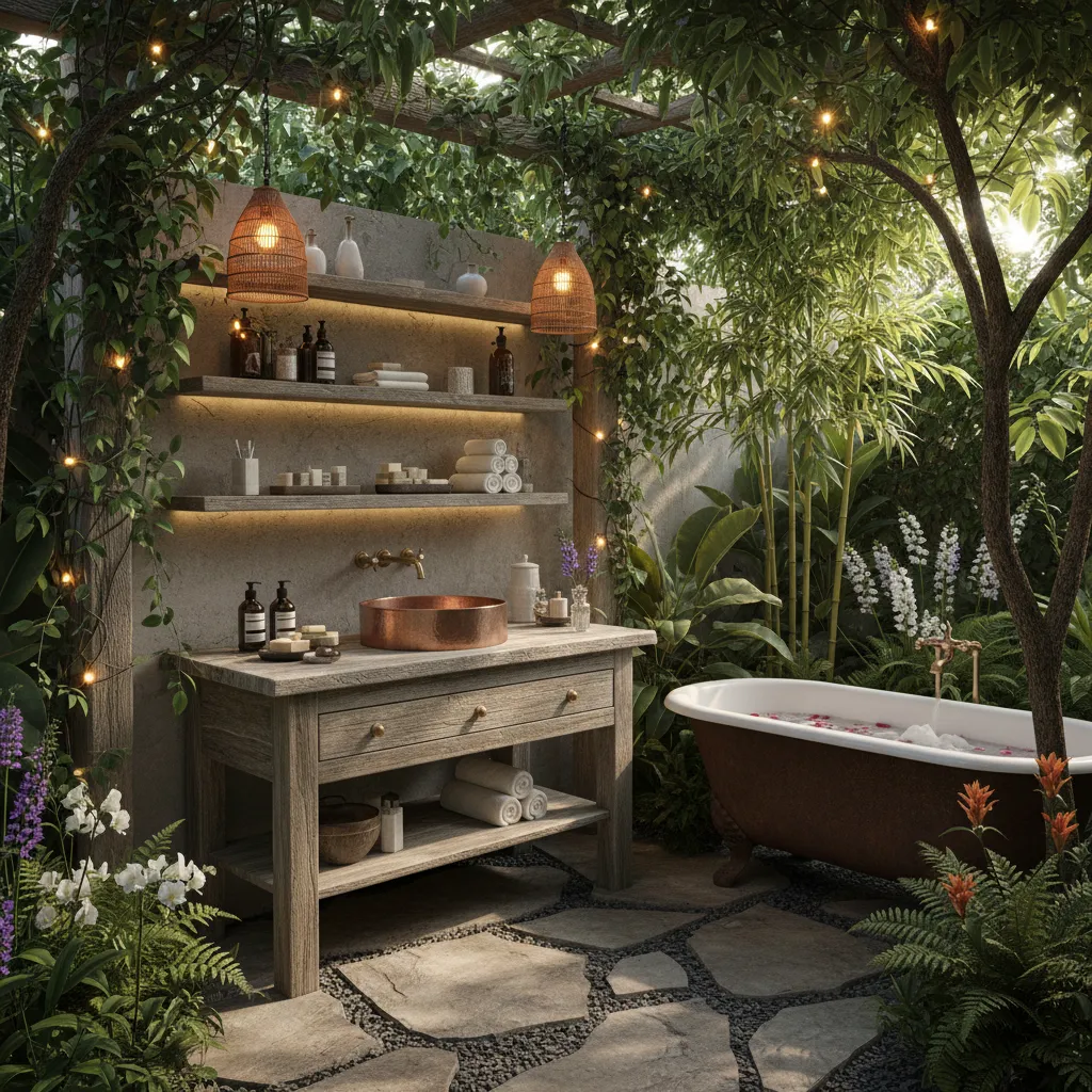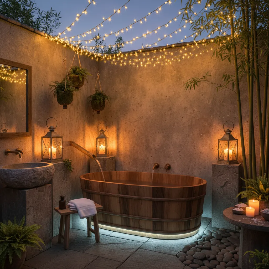 Don’t forget about lighting! String lights, lanterns, or LED strips can transform your outdoor bathroom into a magical space for evening relaxation.