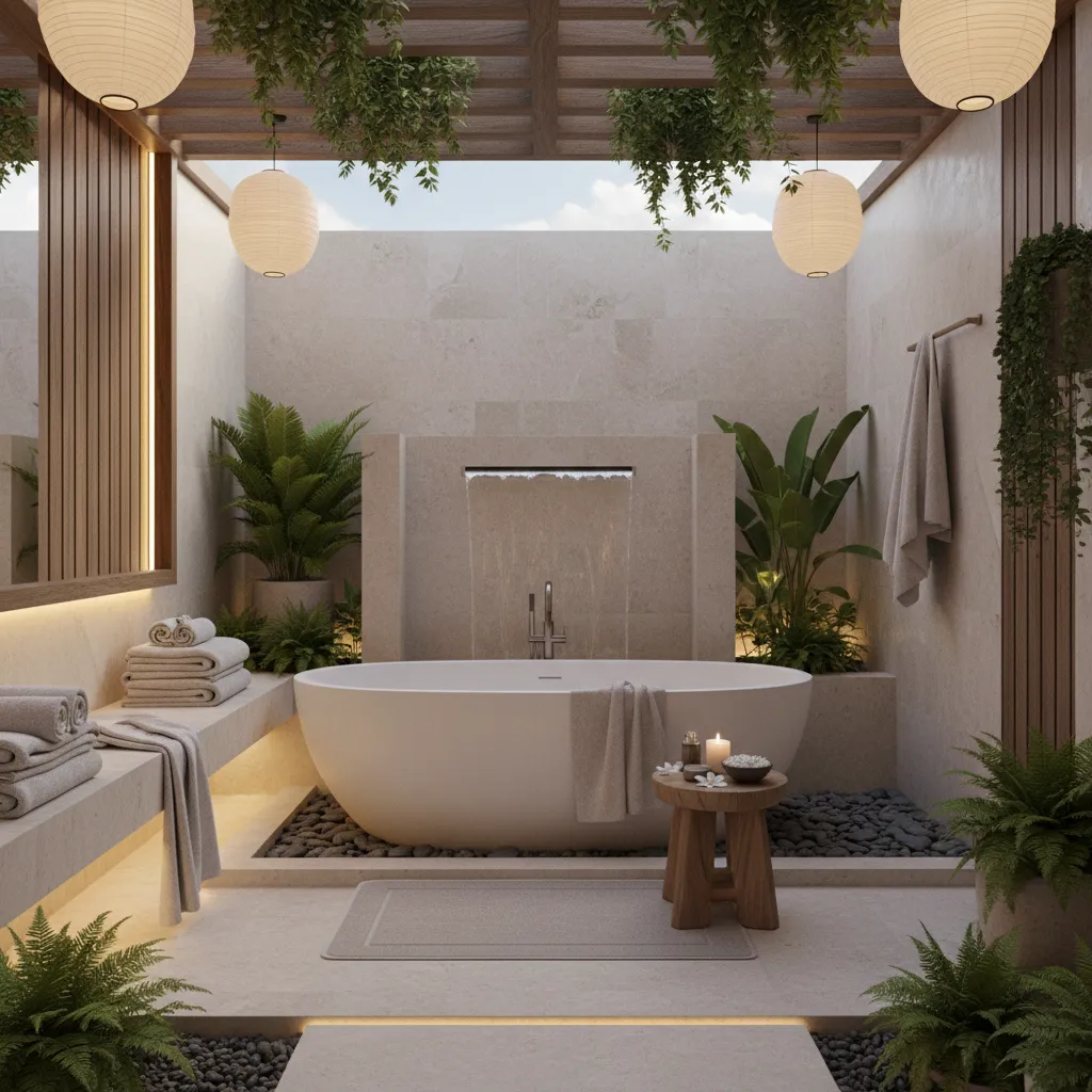 Add layered textures with rugs, towels, and seating. Incorporate greenery, ambient lighting, decorative planters, and natural accents like bamboo or stone to create a warm, tranquil environment.
